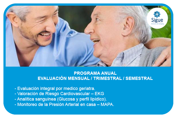 1° Evaluación mensual por medico geriatra, y equipo multidisciplinario según las necesidades de la persona adulta mayor como enfermería, nutrición, terapia física, neuropsicología y otros.